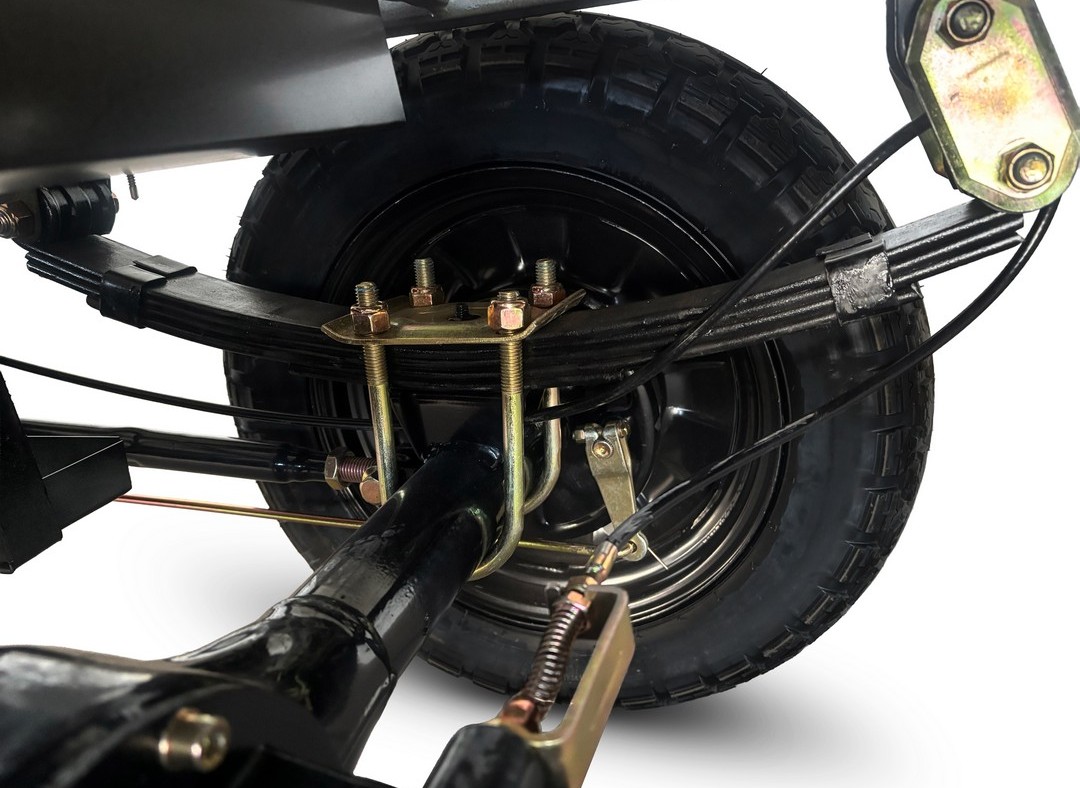 Для комфорта и устойчивости установлены гидравлические амортизаторы спереди и 5-листовая рессорная подвеска сзади, эффективно справляющаяся с нагрузкой до 1000 кг. Тормозная система — барабанные тормоза AEC Drum с ABS и стояночным тормозом. Колёса 3.75–12 имеют усиленное крепление — 5 болтов. Передний металлический бампер защищает конструкцию от ударов, а большая LED фара обеспечивает отличную видимость в темноте.