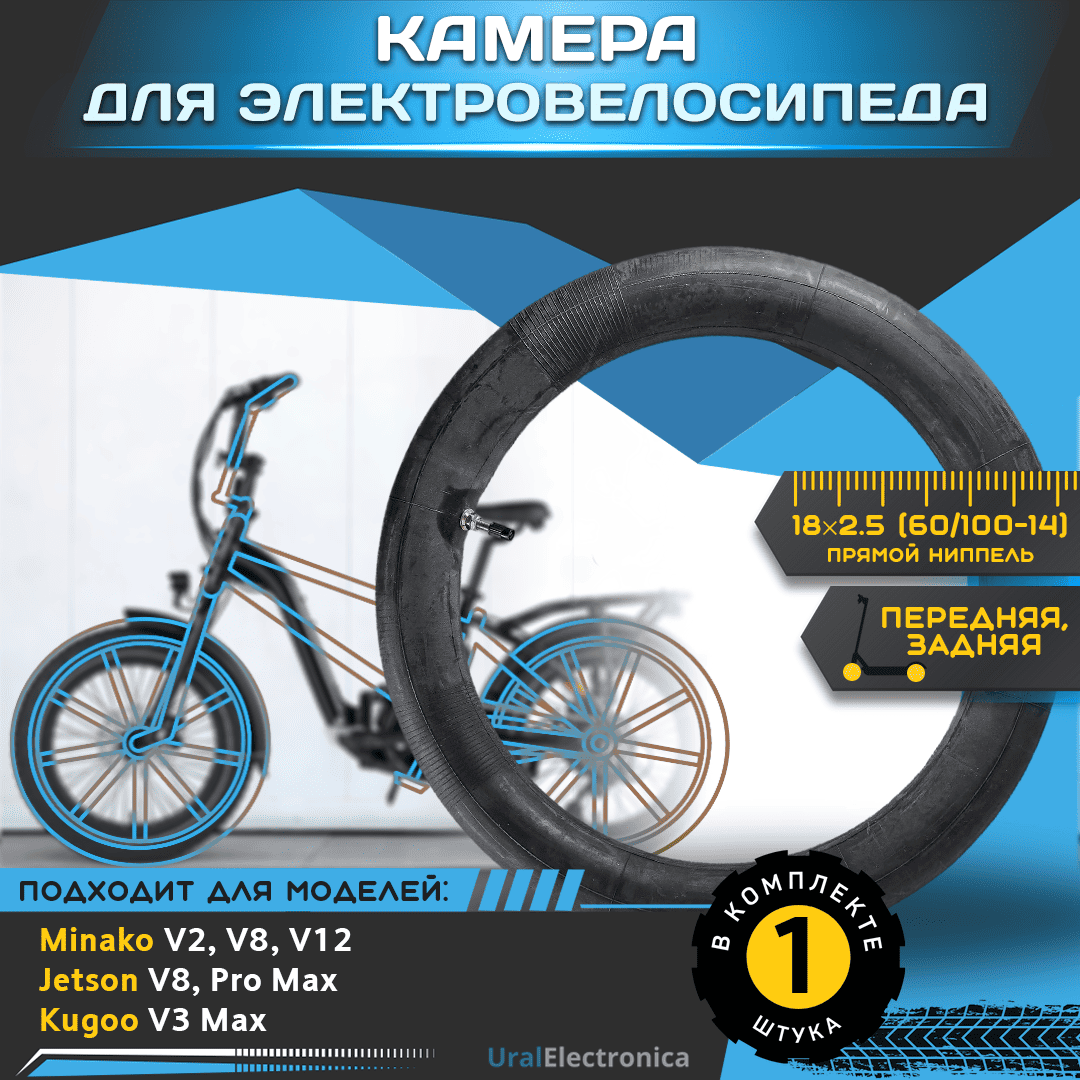 Камера 18×2.5 (60/100-14) прямой ниппель для электровелосипеда Minako V2, V8, V8 pro, V12, V12 LUX, V8 Eco / etson V8, Pro Max, Pro Max Ultra Plus, Pro Max Ultra,Pro Max Classic/ Kugoo V3 Max (для заднего и переднего колеса), а также любого другого электровелосипеда с аналогичным размером камеры, предназначена для обеспечения безопасности и комфорта при езде на велосипеде.