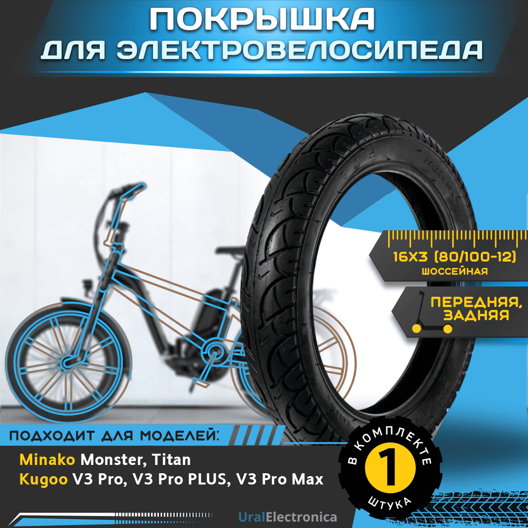Покрышка 16х3 (80/100-12) шоссейная, предназначена для электровелосипеда Minako Monster / Titan / Kugoo V3 Pro, V3 Pro PLUS, V3 Pro Max / Jetson Monster Cross, Jetson Monster Pro, а также любого другого электровелосипеда с аналогичным размером. Резина износостойкая и отличается долгим сроком службы. Данная покрышка обеспечит уверенное сцепление с поверхностью. Возможность установки на переднее и заднее колесо.