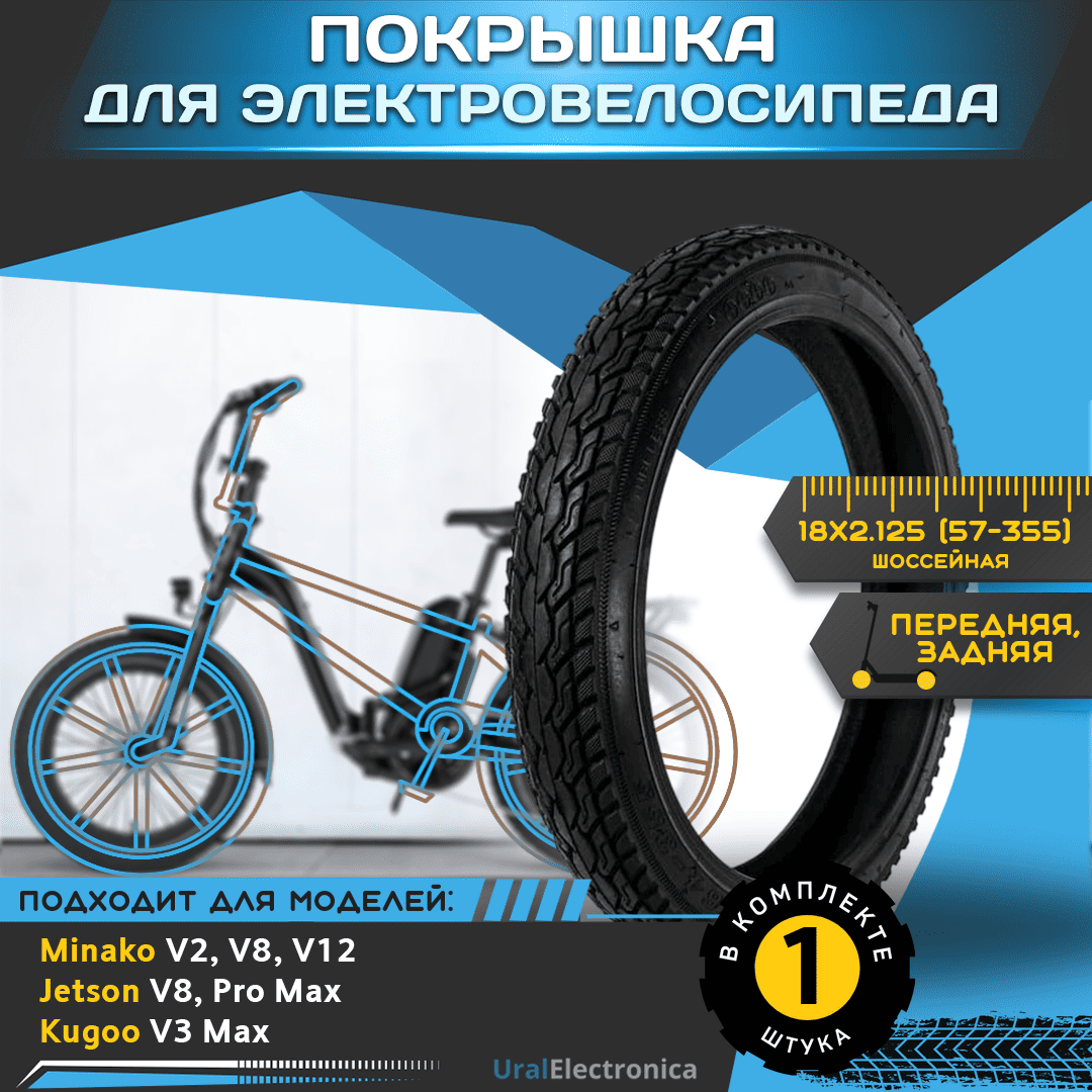 Покрышка 18x2.125 (57-355) шоссейная, предназначена для электровелосипеда Minako V2, V8, V8 pro, V12, V12 LUX, V8 Eco / etson V8, Pro Max, Pro Max Ultra Plus, Pro Max Ultra, Pro Max Classic/ Kugoo V3 Max, а также любого другого электровелосипеда с аналогичным размером. Резина износостойкая и отличается долгим сроком службы. Данная покрышка обеспечит уверенное сцепление с поверхностью. Возможность установки на переднее и заднее колесо.